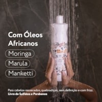 Limpeza suave e eficaz sem ressecar. Fórmula sulfate free com óleos africanos de Marula e Moringa + Proteína do Trigo para hidratar e nutrir durante a lavagem, ajudando ainda a preservar a cor dos fios. Indicado para ondas rebeldes e controle de frizz.